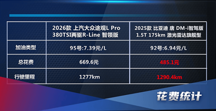 按照北京油价计算,比亚迪唐DM-i175km版(92号汽油)在整个旅途的油费仅需485.1元,途观L的油费(95号汽油)则需要669.6元。